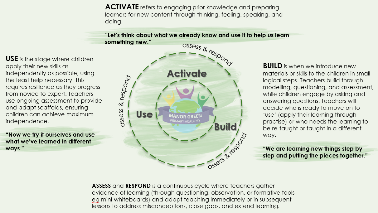 The long term and medium-term sequences take into account four key steps that inform daily instruction. These steps have been adapted from Roshenshine’s Principles of Effective Instruction and at Manor Green all our planning and delivery follows the steps. These are: activate, build, use. When creating learning sequences, teachers carefully consider the gradual release of responsibility mode. Throughout the quality teaching during each step, we consistently assess and respond to meet the needs of the class.